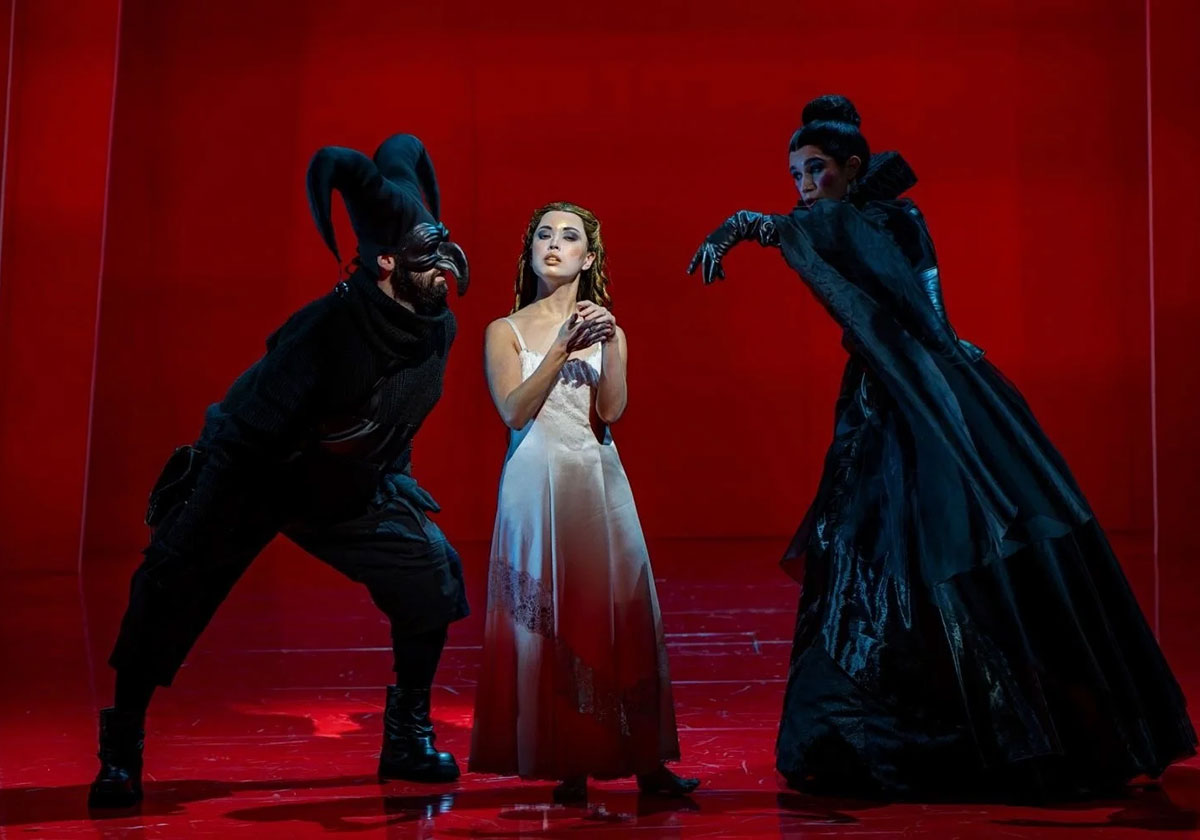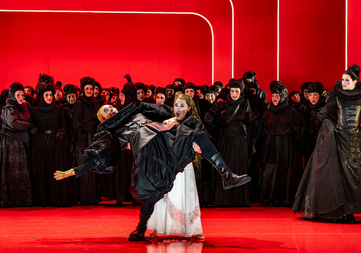 Allenthalben schräge, grelle Kontraste, wo immer man hinschaute. Rot, schwarz, weiß und dieses Spiel von Farben und Licht im steten Wandel. Macbeth – gesungen von Iain McNeil –, einem Hünen, in ein wuchtiges schwarzes Kostüm gewandet, mit Pumphosen und riesigem Kragen, ließ Lady Macbeth wie ein Püppchen wirken.